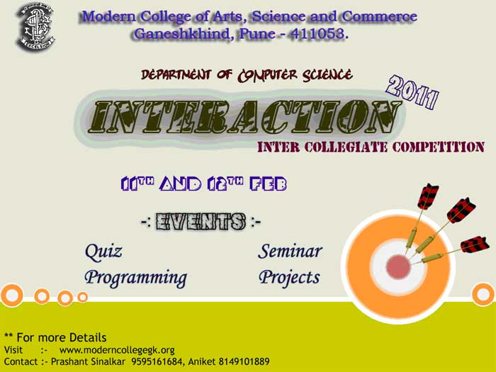 We are happy to communicate you regarding our annual activity of Computer Science Department “INTERACTION 2011”. The event will be held on 11th and 12th February 2011. We welcome your Computer Science Student’s participation for this Inter Collegiate Competition.